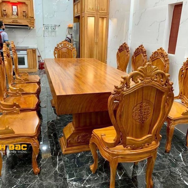 Gỗ Gõ sở hữu đặc tính bề mặt mịn, chất gỗ đặc. Hơn nữa chúng còn dễ bắt vít nên việc chạm khắc cũng dễ dàng hơn so với các loại gỗ thông thường. Những họa tiết được đục chạm lên gỗ rất tinh xảo và kỳ công. Từ đó tạo nên những mẫu bàn ghế ăn có thiết kế vô cùng sang trọng và đẳng cấp.